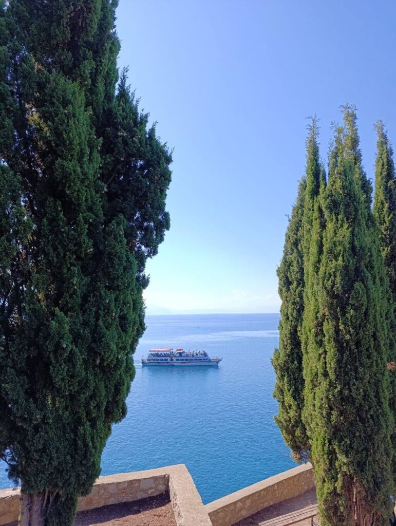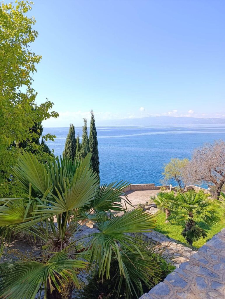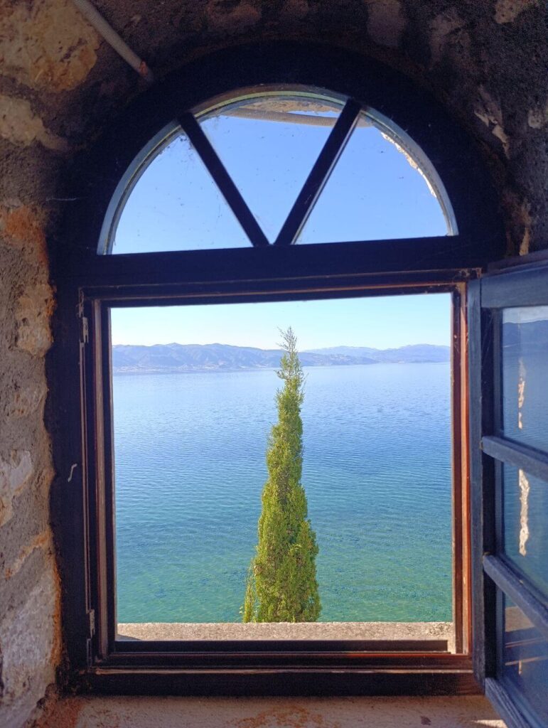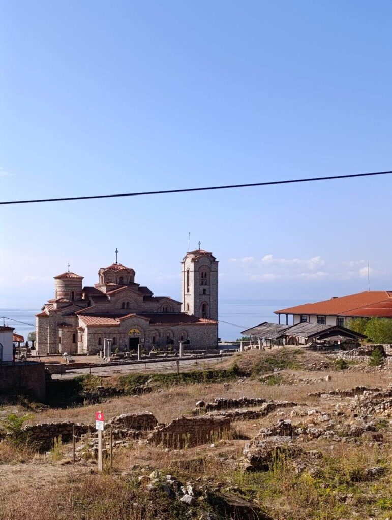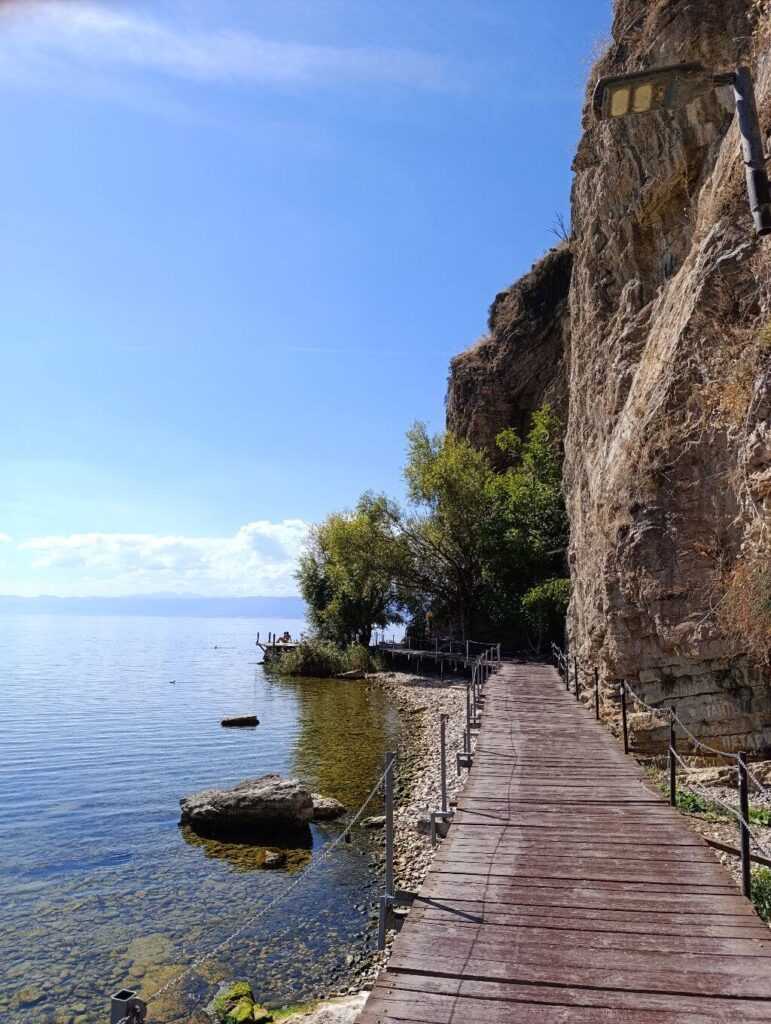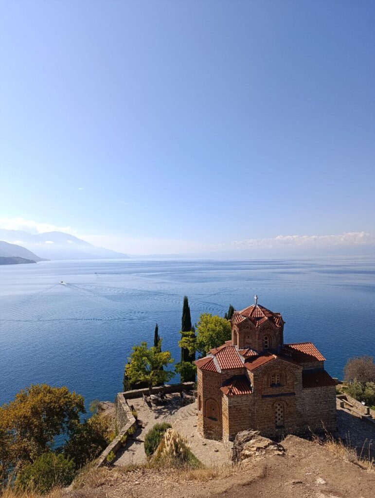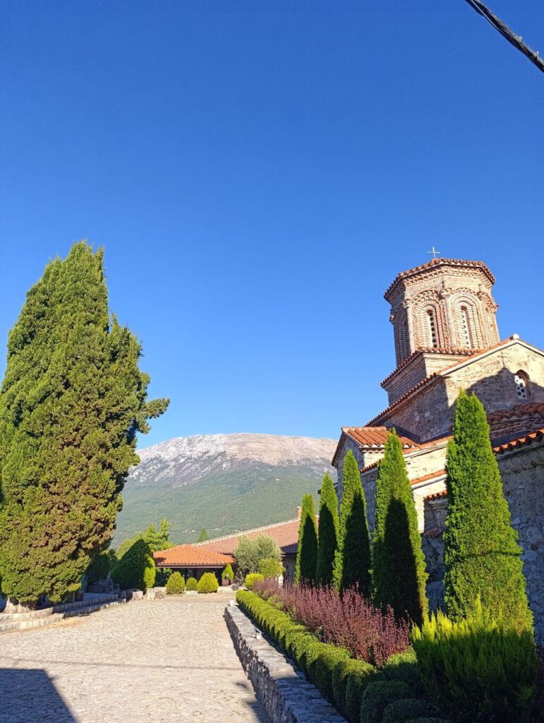 A tó talán leglátogatottabb helyszíne a macedón-albán határon fekvő kolostor. Trpejcától még további 10 kilométert kell vezetni, és meg is érkezel. A parkolásért fizetni kell, 2025 szeptemberében 100 dénár volt az ára, amelyért korlátozás nélkül bármeddig maradhatunk.